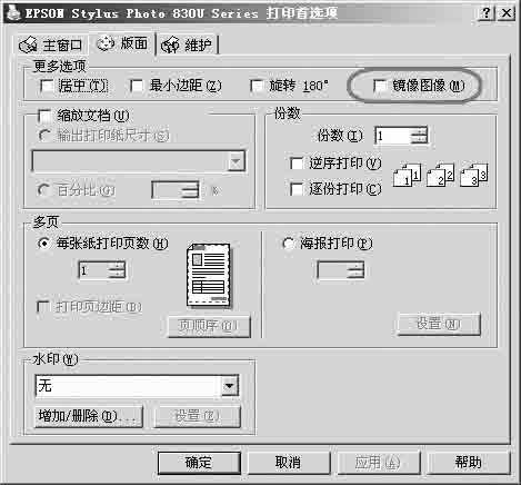 在这里需要说明的是,因为笔者选用的转印纸属于新型转印纸,它和以往的转印纸需要将图像正面朝下贴住T恤进行转印不同,在转印时图像正面始终是朝上的,不会直接和T恤接触,因此在打印设置时无须选择采用镜像打印。但是,如果你购买的打印纸不是这种类型,则必须在“版面”选项卡中将“镜像图像”勾选(如图4)。