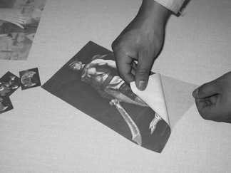首先,将电熨斗设置为最高温度挡进行预热。然后,将T恤平铺在熨衣板上,并用预热好的电熨斗将它烫平以确保没有皱褶。接下来将转印纸的光面的透明薄膜撕去(如图6),图像正面朝上粘贴到T恤的适当位置,并用防粘纸盖上(如图7)。