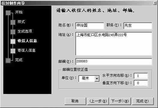 这一步的作用是可以标准地制定出信封的编辑页面,它为输出信封时文字的准确定位做好了铺垫。接下来进入“请输入收信人的姓名、地址、邮编”对话框,请注意“邮编位置校正值”部分的“水平方向右移”项和“垂直方向下移”项──在打印样封后,邮编的位置精确调整就要靠它们了。经验告诉我们,“水平方向右移”项最好先设置为1~2,这样才能让信封打印中最不好控制的“居中”操作相对容易些(图2)。