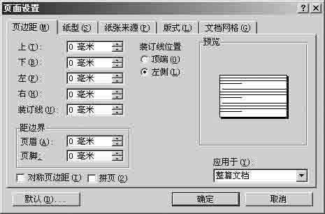 此时大家就要注意了:有时信封打印输出时出现内容位置错位的关键就在这里,之所以出现这种情况,是因为Word没将页边距计算在内的缘故!因而此时应双击“标尺”的任一处,在弹出的“页面设置”对话框中将各个边距都设置为“0”(图4)。
