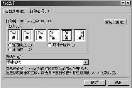 提示:在上述设置完毕后,先不要急着将信封放进打印机中进行打印。这是因为信封放进打印机的方向一般都是竖着的(即有邮政编码框的一面向下)所以打印机的搓纸轮往往只能用到一个,这个时候首先要注意打印机的搓纸轮在什么位置,例如HP 6L打印机的搓纸轮是在中间,那么就应将信封放在中间部分后,再将夹纸板移动至中间位置夹住信封才行,这样打印出的信封内容才会垂直(也就是说要正确掌握打印机的信封输出模式)。