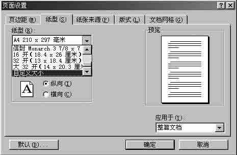 点击“文件→页面设置”菜单项,在弹出的对话框中点击切换到“纸型”选项卡设置界面,点击“纸型”项的下向箭头,在弹出的列表框中选择最后一项“自定义大小”(图11)。