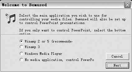 第一步:启动BemusedServer.exe后,第一次弹出的是图1所示的对话框,从这个对话框中,可以看到Bemused的作用了。这里笔者以控制Winamp3为例来设置该软件,在图1中选上Winamp3,按“Next”按钮。