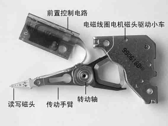磁头组件(图6)是硬盘中最精密的部件之一,它由读写磁头、传动手臂、传动轴三部分组成。其中磁头是硬盘中最重要的部分,一块硬盘中的每张盘片都配有一个读写磁头,而这些磁头又连接在同一个传动机构上。磁头加电后在高速旋转的磁盘表面上0.1~0.3μm的地方移动,磁盘的数据。