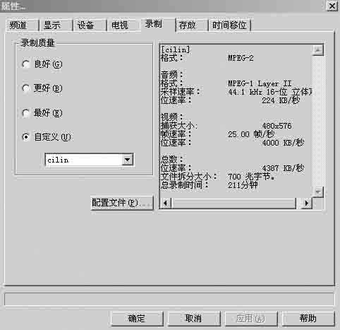 进入WinDVR控制面板“设置”选项,在弹出的设置界面中对“录制”进行设置,WinDVR提供了“良好”、“更好”和“最好”三种固定录制模式,其中“最好”是标准的DVD视频格式。我们也可以选择“自定义”,根据自己对视频文件清晰度的要求情况进行设置(图1),一般对于家用级摄像机拍摄的视频文件而言,对标准SVCD格式稍作修改即可满足我们对清晰度的要求。