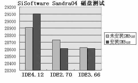 磁盘方面,IDE4.12得分稍高于IDE2.70、IDE3.66,看来正式版驱动确实有所改进。笔者还测试了安装SMBus4.04以后的磁盘性能,从测试成绩看来新SMBUS驱动对磁盘性能有所改善,安装以后得分又有所提高,而且测试中并没有任何不稳定现象,看来这一版本的SMBus驱动已经比较稳定了(见图1)。