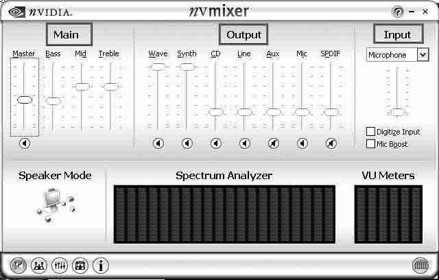 新驱动在音频部分改进很大,新的音频控制面板采用银色WinXP界面,功能进行了细分,在“NvMixer”面板中,音量调节、多声道控制、均衡调节、环境音效分成了四部分。在音量控制面板中:主音量控制、音频输出、音频输入分别在三个框架内,非常直观,调用各种功能时也方面多了,不必再频繁切换各个子面板(见图2)。