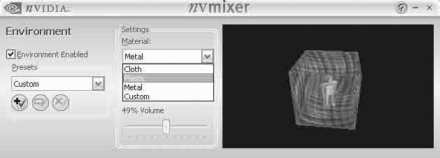 新驱动还简化了Environment音效环境设置,初学者还可以从“Preset”预设选框中直接选择相应环境音效;在“Material”框内可以调节墙面的声音反馈效果。有Cloth、Plastic、Metal、Custom四种方案可选,再配合Decay声音衰减还能达到较真实的音效环境(见图4)。