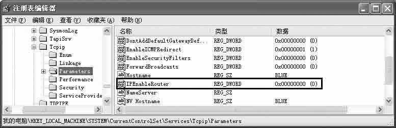 系统路由任我开关 网络通信 刘福浩 · 2004年6月7日 Windows 2000/XP系统中的路由功能可以由用户随意决定它们的开关,通过修改注册表即可轻松搞定。 打开注册表编辑器,找到或新建“HKEY_LOCAL_Machine\System\CurrentControlSet\Services\TCPIP\Paramters”分支(见图),在右侧窗口中将子键“IPEnableRouter”(REG_DWORD型)的值修改为1(1为禁止系统路由,0为允许系统路由)。修改完成后,重新启动计算机即可。