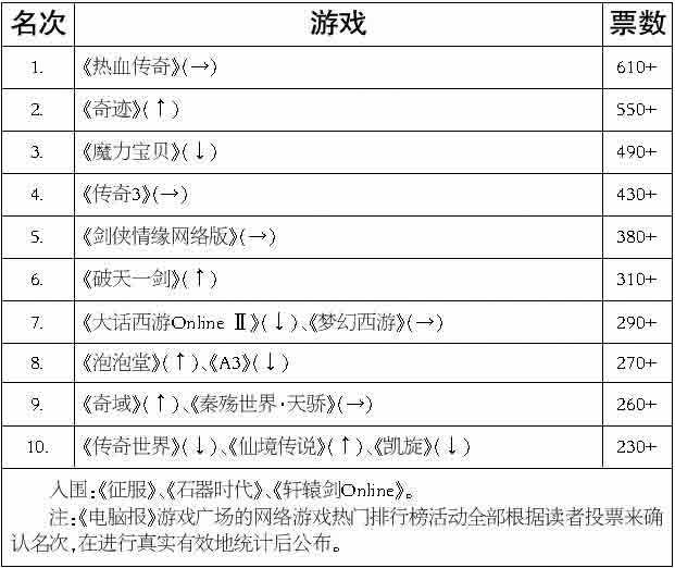 2004年6月份的网络游戏热门排行榜活动现在已经开始了。投票的方式没有改变,无论是通过平信(邮寄地址:重庆市渝中区双钢路3号科协大厦,电脑报游戏广场收,邮政编码400013,请在信封背面标明网络“游戏排行榜”字样,并且最好直接在信封背面或明信片的空白处醒目地写出你所选择的网络游戏名称)或E-mail(chenz@cpcw.com)的方式投票,都请详细注明自己的联系地址、邮政编码和真实姓名(否则视为自动弃权,统计票数但不参与抽奖),这样我们才能更好地统计票数和抽取获奖者。