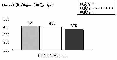 Quake3对于内存的带宽比较敏感,内存性能强劲的系统一优势非常明显,在32bit操作系统下的成绩超过了系统二大约11%。此外,系统一的CPU与北桥之间高达2000MT/s的带宽使得采用AGP接口的显卡与CPU 之间的数据传输率大大提高,因此系统二传统的架构在这里明显础下风。