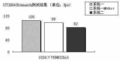 在以前的测试中,UT2004占用大量CPU资源的BOTMATCH测试一直受到CPU和内存带宽的限制,即便是再好的显卡也不能得到很好的成绩。现在我们可以看到,系统一在32bit操作系统下的得分已经超过了系统二28%以上。而在64bit系统下,系统一的测试成绩只是稍有下降而已。