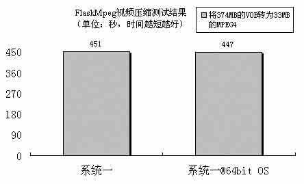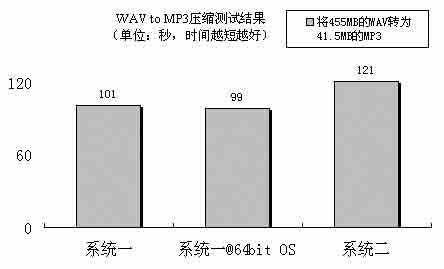 系统一在音频压缩测试中也取得了不错的成绩,比系统二快了6%左右。虽然音频压缩主要考查的是CPU处理流媒体的性能,但是系统的内存性能、南北桥之间的数据传输速度、磁盘性能等都会对测试成绩造成一定影响,因此这也是对整个系统的性能测试。