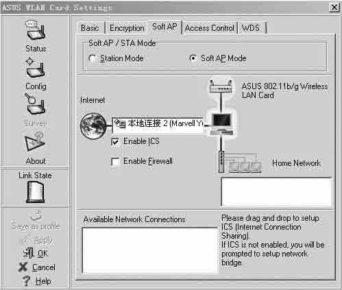 主板附件中包括了一块无线网卡和一根天线,将主板上的千兆网卡与Internet连接设置完毕后,再安装无线网卡,接下来在系统中安装ASUS自己开发的管理软件,选择Soft AP模式,然后在上图中左边部分的框处选择好Internet连接,确定后基站部分就设置完毕了。