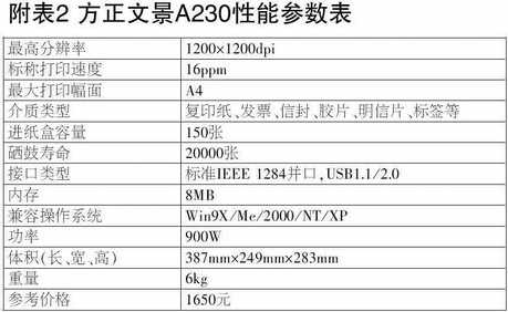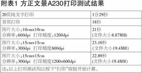文景A230的分辨率可以达到1200dpi,对于一般的商业用户来说,600dpi就已经够用了。它的预热时间在17秒左右,而首页打印则可以在13秒内完成。A230所能打印的纸张也比较多,除了A4、A5等常见的打印纸之外,还可以打印明信片、胶片等一些特殊的介质,说明书上有详尽的介绍。因为笔者时常会跟一些排版软件打交道,所以发现这款文景A230打印机不但对于方正的《飞腾》排版软件(国内出版业中比较流行的排版软件,市场占有率较高)有着很好的支持,其他打印机打印不出来的效果用这款文景A230却可以实现,当然这里指的效果是针对排版软件排出的版式效果,这和方正多年在排版打印机方面的研发密不可分。