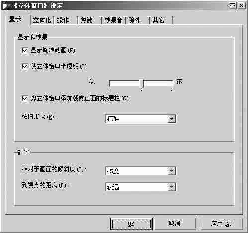 单击切换到“显示”选项卡设置立体窗口显示效果,选取“使立体窗口半透明”复选框,可以使立体窗口实现半透明效果,同时拖动滑块可以改变半透明深浅度。在“配置”选项中可以设置立体窗口的倾斜的角度,比如设置窗口倾斜角度为45°,到视角的距离为“较远”(图1)。