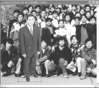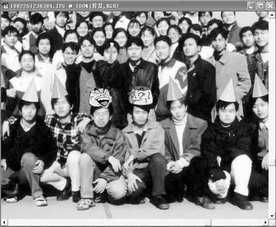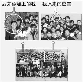 大学四年的时间一晃而过,在临近毕业时才觉得学友之间的情意珍贵。在最值得纪念的毕业照中我却在一个不起眼的角落里,除了有我的一个头顶外,五官都看不到。难道玉树临风的我就这样被前面的“猪头”阿飞埋没了?不行,谁也别想抢我的风头!经过一番PS(Photoshop处理)后,我终于以最帅的姿态站在了显要的位置(图1)!