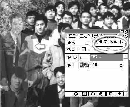 4.人物的位置确定好后,打开图层控制面板,在图层面板上我们看到拷贝进来的人物图层是“图层1”,点上面的透明度,将它设置为50%左右(图3)。我们可以看到毕业照中拷贝进来的人物就变得透明了。