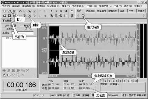 在主窗口中的波形窗格中通过鼠标拖动来选取声音片段,你可使用“播放”按钮试听来确定哪些是不要的部分,然后按“删除”键将它去掉。编辑的时候一定要注意音频片段的总长度,因为手机对所传输的MMF文件大小是有限制的。如三星手机所带的EasyGPRS软件,只能传输32KB以下的手机铃声,如果是16和弦大约为10秒多一点,40和弦则只能有4~5秒长了(如果重刷手机固件可去掉这些限制)。