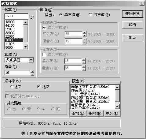 单击右上角“格式”标签下的“格式转换”按钮,在弹出的“转换格式”对话框(图2)中设置WAV文件的规格,采样频率(频率)可选择为16000、11025、8000Hz三种,其中16和弦使用8000Hz就行了。通道一律设置为“单声道”,采样率(实为量化级)一律设置为16位,完成后单击“开始转换”即转化为设定的规格。