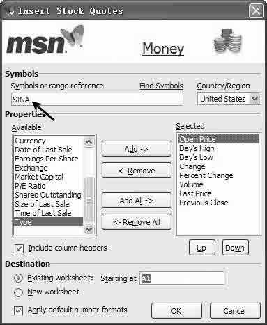 Step3:在“Properties”区域可以设置查询股票的报价类型,比如在“Available”中可以选择“Change”(涨跌)、“Day's High”(最高点)、“Day's Low”(最低点)、“Last Price”(收盘价)、“Open Price”(开盘价)、“Previous Close”(昨日收盘价)、“Volume”(交易量)、“Percent Change”(涨跌幅),在“Selected”区域可以单击“Up”或“Down”按钮调整其位置;在“Destination”区域可以设置股票行情数据插入的目标位置。最后,单击“OK”按钮来插入股票行情数据(图5)。