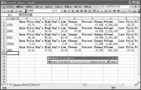 Step1:安装MSN Money Stock Quotes插件后,运行Excel,在主窗口中会显示一个浮动工具条,在工作表中选择一个位置,单击“Insert Stock Quotes”,在弹出的窗口中输入相应信息就可以获取股票报价。
