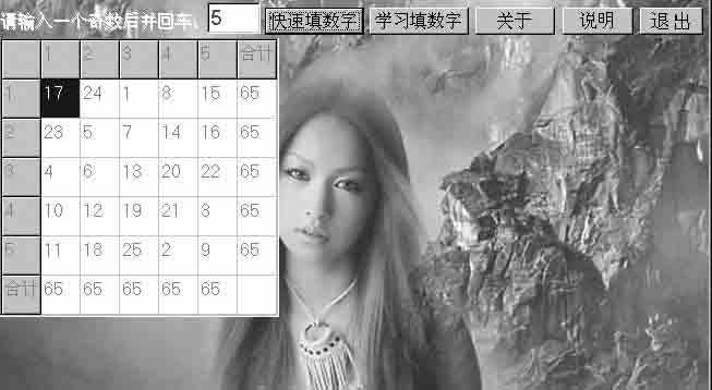重温金庸的《射雕英雄传》,读至“第二十九回 黑沼隐女”时,号称神算子的瑛姑居然不会九宫图,甚感好笑。但九宫图是什么呢?记得小学的寒假生活上就有这么一道题:将一至九这九个数字排成三列,使之不论纵横斜角,每三个相加和都是十五,这就是九宫图。当然3的平方9个数是很容易填的,不过5的平方呢?7的平方呢?经过一番摸索,我终于用程序实现了n的平方(n为奇数)的表格自动填写,使之不论纵横斜角,数字之和必等。用它来解九宫图,自然不在话下。