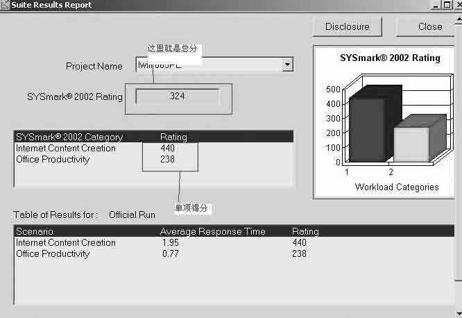 为了让我们能够从分数上直接比较电脑的性能,SYSmark的打分采用了比较法。它首先创立了一个基准平台,并且以它的分数为100。把通过测试所得到的分数和这个基本平台分数作比较,我们就基本知道正在测试的电脑性能和速度如何了。