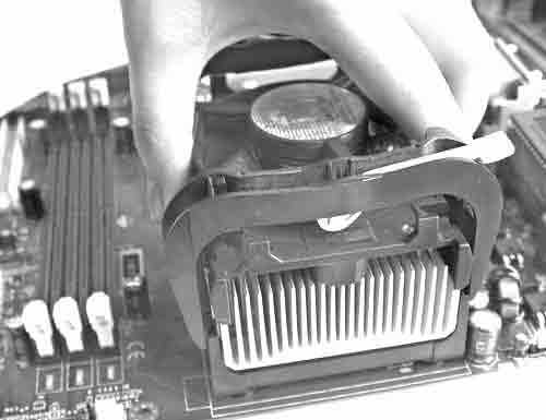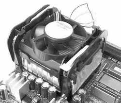 对于AMD AthlonXP平台,首先要将散热器水平置于CPU核心上方,然后垂直压下,这样就使涂抹的硅脂由于压力作用均匀地填满散热片和CPU核心之间的空隙。