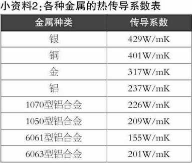 热传导系数:热传导系数是有材质本身的特性(所含化学元素)决定的。热传导系数越高,热量就传递得越快。在金属中,银的导热系数比铜高了少许,而金的传导率远小于铜。而在铜和铝中,铜的传导系数则比铝高将近40%(各金属的热传导系数请参见F13版的小资料2)。
