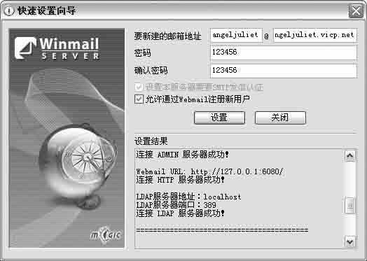 当安装完成后,系统会自动调出“快速设置向导”程序(图1)。请在“要新建的邮箱地址”的“@”后面输入公司的域名,如果没有合法的域名,可以随意输入几个英文(邮箱的使用会有一定限制),然后再选中“允许通过Webmail注册新用户”选项,单击“设置”按钮后即可在下面的“设置结果”列表中清楚地看到相关信息。