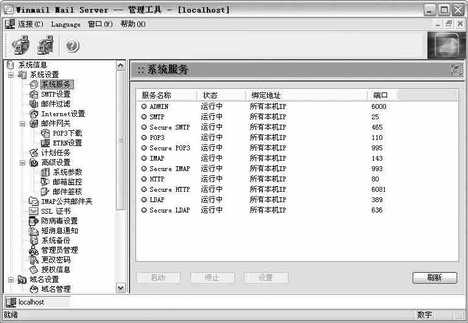 邮件的正常收、发必须要得到相应的服务支持,但是有一些意外的情况可能导致这些服务停止运行,此时我们要手工启动这些服务了。打开管理工具,进入“系统设置→系统服务”(图2),当有服务的状态为“停止”时,请单击“启动”按钮启动服务,如果启动不成功,可能是因为该服务所使用的端口被其他程序占用了,这时候单击“设置”按钮,更改所使用的端口即可解决问题。