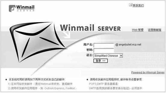管理程序设置好后你就可以让其他人申请邮箱并使用邮箱了。在任何一台可以联网的计算机中,都能在浏览器地址栏中输入邮件服务器的IP地址或域名打开邮箱的登录界面(图3)。
