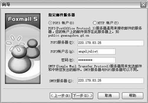 打开Foxmail程序,单击“账户→新建”进入“向导”窗口,然后按照程序分别输入用户名(例如“企业邮箱”)、“发件人姓名”及“邮件地址”(就是申请的邮箱地址),再单击“下一步”按钮,在“指定邮件服务器”设置窗口中选择“POP3账户”(图4),然后在“POP3服务器”和“SMTP服务器”中输入邮件服务器的IP地址或域名即可。这样设置后,你就可以使用Foxmail来收、发邮箱中的邮件了。Outlook Express中设置与此类似,大家可参考上面的设置方法进行设置。