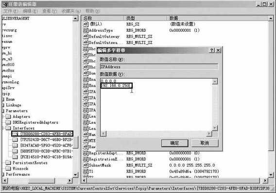 点击“开始→运行”,在运行对话框中输入“Regedt32”命令,点击“确定”后弹出“注册表编辑器”窗口。在左侧框体中找到“HKEY_LOCAL_MACHINE\SYSTEM\CurrentControlSet\Services\Tcpip\Parameters\Interfaces”,然后在“Interfaces”项目中找到连接局域网的网卡所对应的ID编号。接着在右侧框体中找到“IPAddress”键,双击打开后进行编辑,如要添加“192.168.0.250”这个静态IP地址(图1),在“数值数据”多字符串编辑对话框中输入该IP地址,当然也可以指定多个静态IP地址,要注意每个IP地址都要单独占一行,最后点击“确定”按钮。