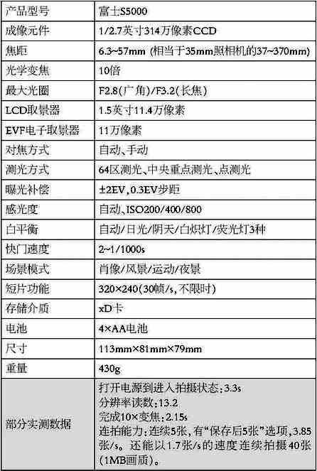 S5000为300万像素机型,采用了富士第四代Super CCD HR,最大输出像素达到了600万。它的镜头为富士珑镜头,最大光圈F2.8/3.2,焦距为6.3~57mm,相当于35mm照相机的37~370mm。