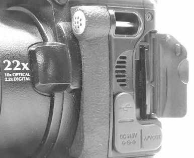 富士有多款6×变焦机型,这款S5000是富士数码相机家族中惟一一款10×变焦产品。它的外形十分专业,全黑色机身,采用了皮质感外壳,细节处的设计也非常类似于专业相机。我们从图中可以看到,它的xD卡插槽、麦克风、扬声器和USB接口等都集中在机身左侧,但是并没有拥挤的感觉,整体感相当好,看起来还相当酷!S5000的握持感相当不错,尤其是单手的握持感非常好,而且常用功能都可以单手搞定。