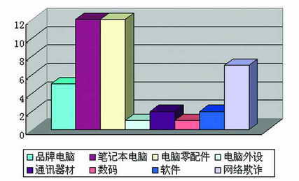 2004年5月1日至6月12日,《电脑报》投诉热线栏目共收到投诉45件,其中,真实投诉42件。在42件真实投诉中,品牌电脑类投诉为5件、笔记本电脑类投诉为12件、电脑零配件类投诉为12件、电脑外设类投诉为1件、通讯器材类投诉为2件、数码类投诉为1件、软件类投诉为2件、网络欺诈类投诉为7件。电脑零配件和笔记本电脑类投诉各占据总投诉量的28.6%、网络欺诈类投诉占据16.7%,这三项的投诉占本次统计的总投诉量的七成,显示为近期消费投诉热点。