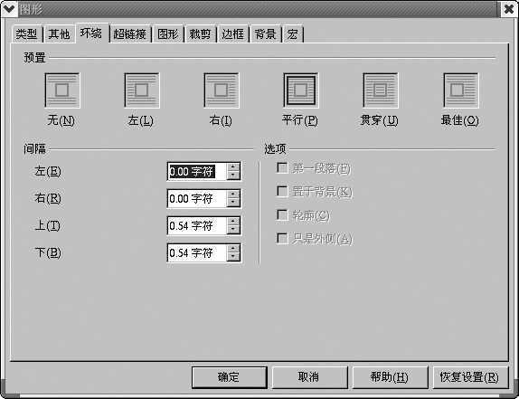 优秀的文档怎能没有精美的图片呢?选择主菜单“插入→图形→从文件”后便会弹出插入图形对话框,从中找到要插入的图片文件,确定后便可插入到文档中,双击插入的图片就会弹出图形对话框,在该对话框中可以设置文字环绕,边框以及完成图片的裁剪与翻转。详细选项请参照图2。