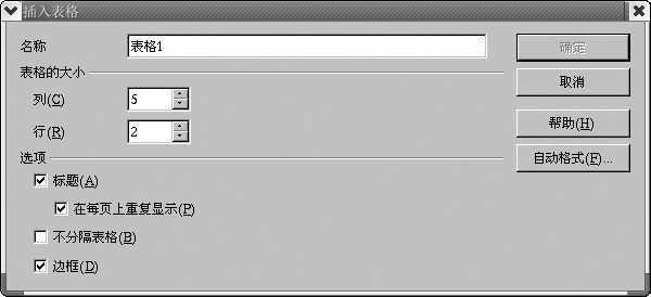 一个具有说服力的文档不能没有表格,选择主菜单“插入→表格”后便会弹出插入表格对话框,在该对话框中简单地设置一下行数和列数便可立即生成表格,接下来便可输入内容编辑表格了!插入表格对话框请参照图3。