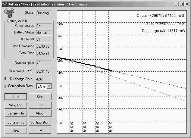 拔掉外接的电源适配器,开机后运行该程序,点击程序主界面上的“Battery Info”,弹出Battery Information窗口(图1),在这里可以看到本本的生产厂商、编号、续航时间、类型、电压、设计容量和可充的容量等信息。一般笔记本电脑用户是无法了解到电池的设计容量、当前容量和满充容量的,通过BatteryMon用户可以清楚了解这一切。