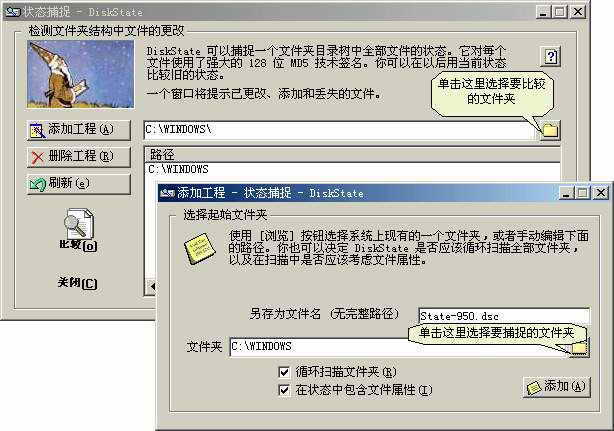 首先我们需要在执行安装程序之前捕捉一次文件夹状态。单击“比较”,会弹出“状态捕捉”对话框,单击“添加工程”选择要捕捉的文件夹,捕捉到的文件状态会被保存在一个扩展名为.dsc的文件中,它位于被捕捉的文件夹之中(图4)。在单击“添加”后软件会询问你是否现在就捕捉文件夹状态,选择“是”即可开始捕捉。