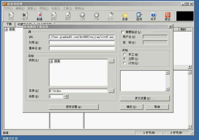 3.现在,我们就打开NetTransport(影音传送带)。选择“新建”按钮(图1)。怎么样?刚才我们复制的地址就到了“源”的“URL”里面了。将“块数”选为1,因为多了也没用,就只会报错。然后点击“确定”就开始下载了。