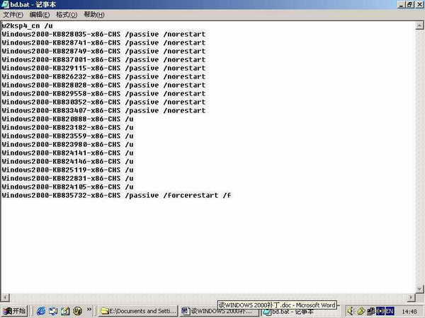 按照前面介绍的方法,把所有的补丁程序,写在一个记事本里,记得加上相应的参数,如图2所示。然后保存为批处理文件,这里取名为BD.BAT。使用时,只需双击BD.BAT文件就可以自动打上所有的补丁。