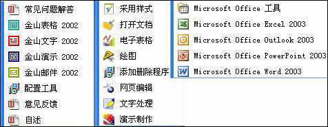 安装好WPS Office飓风版之后,你就能够在开始菜单的程序上面看到WPS Office飓风的选项。为了让大家更加直观地看到WPS飓风版的特点,笔者特意找来了Office 2003和WPS2002的程序选项图进行对比。从图1可以看出,WPS飓风版主要由“文字处理、电子表格、网页编辑、演示文稿”等五个主要组件组成,分别对应Office 2003的“Word、Excel、Powerpoint、Frontpage”的集成办公套件,这四个组件应该没有多大变化。