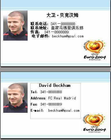 Step4 图片插入了,数据也输入了,小贝的名片基本上OK了。左看右看似乎觉得少了点什么,既然是在欧洲杯期间,就应该上一张2004欧洲杯的Logo嘛,以体现这张名片的时尚性。点击“插入→图形→来自文件”,输入2004欧洲杯Logo就大功告成了(图3)。
