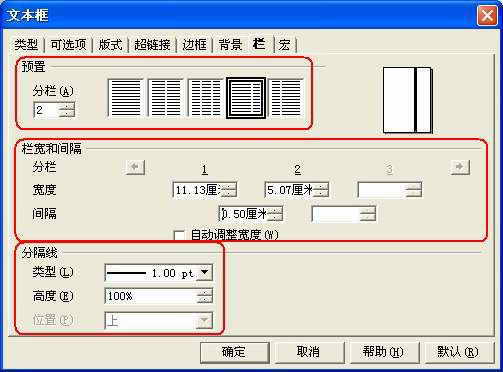 “文本框”中的字符支持分栏功能,这是“飓风文字处理”的一个特有功能:双击“文本框”打开“文本框”属性对话框(图4),切换到“栏”标签下,在这里设置好分栏的“栏数、栏宽和间隔、分隔线”等要素后,确定返回。