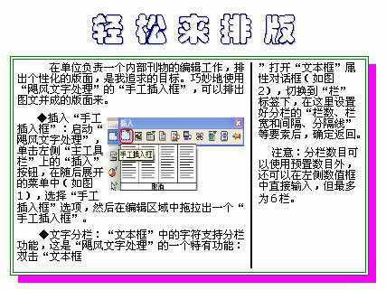 在单位负责一个内部刊物的编辑工作,排出个性化的版面,是我追求的目标。巧妙地使用“飓风文字处理”的“手工插入框”和“图形框”等,可以排出图文并茂的版面来。