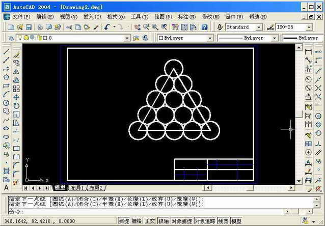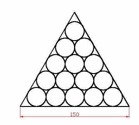 在一次AutoCAD竞赛中,一道题难住了不少人,题目的要求是建立一个边长为150的正三角形,并在正三角形中绘制15个圆,其中每个圆的半径相等,各个圆与三角形各边之间两两相切(图1)。