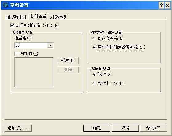 单击“工具→草图设置”,进入“草图设置”对话框,切换到“极轴追踪”选项卡,在这里设置极轴的增量角。由于是一个正三角形,因此“增量角”应该设置为60°(图3),并选中“用所有极轴角设置追踪”项;接着切换到“捕捉和栅格”选项卡,勾选“启用捕捉”复选框和“极轴捕捉”单选框。极轴距离指圆的直径值。